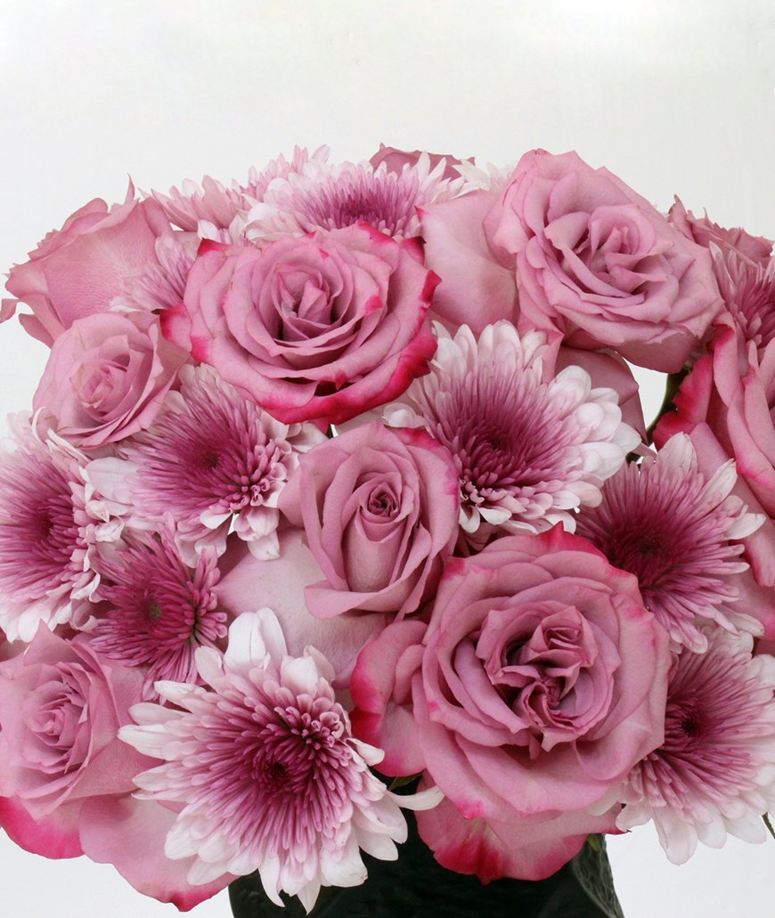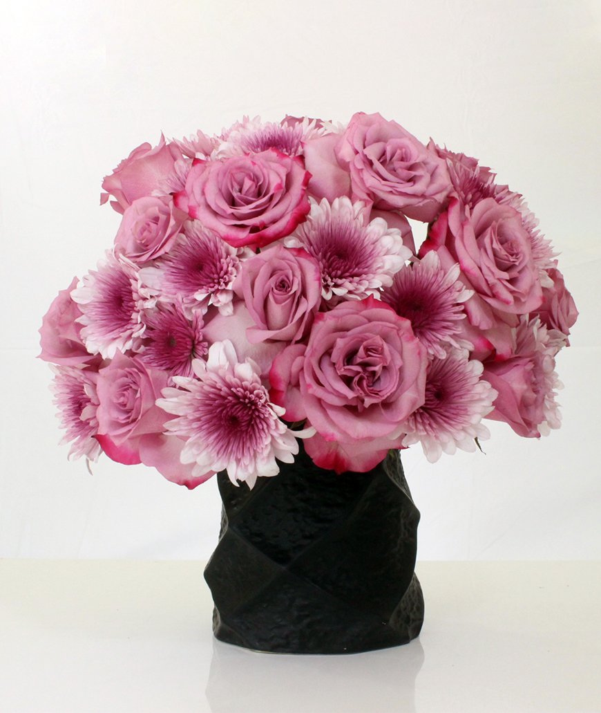 A striking black vase filled with luxury royal roses and premium royal chrysanthemums, crafted to create a full, elegant centerpiece perfect for gifting or special occasions.