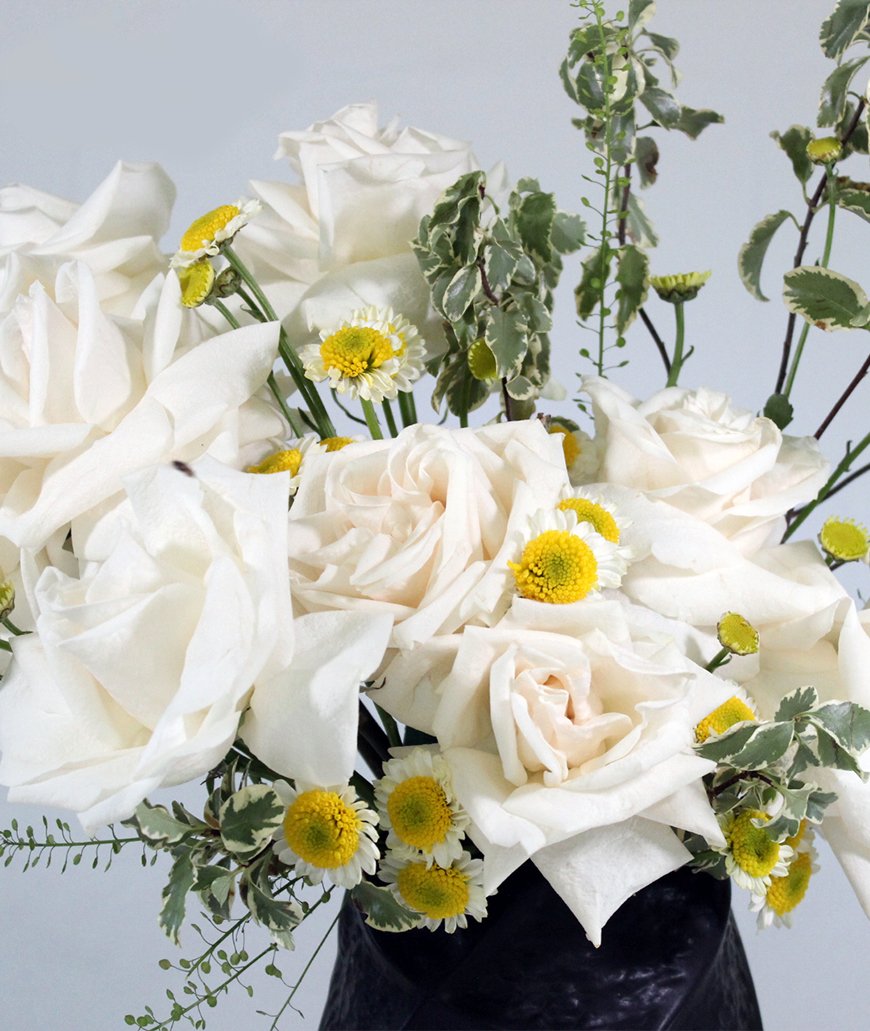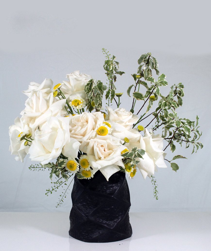 A refined vase arrangement featuring pristine white roses paired with lush, premium greenery and elegant accents. Designed to reflect understated luxury, making it a perfect choice for sophisticated gifting and stylish occasions.