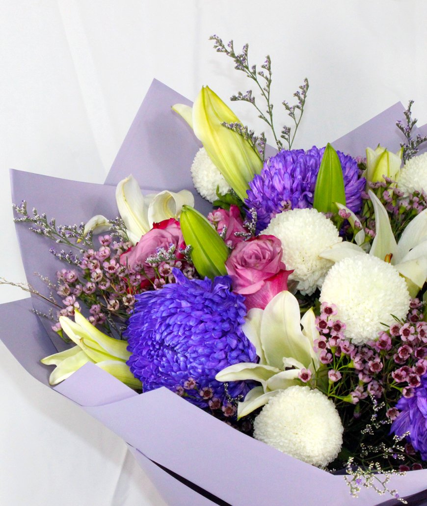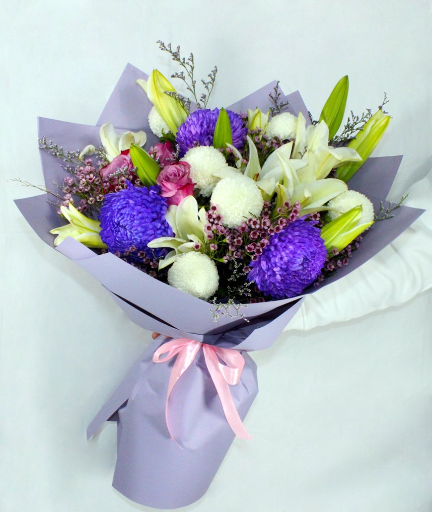 A luxurious large mixed bouquet blending purple deco florals, white baby bloom, and lily flowers, enhanced with premium accessories for an elegant and striking presence.