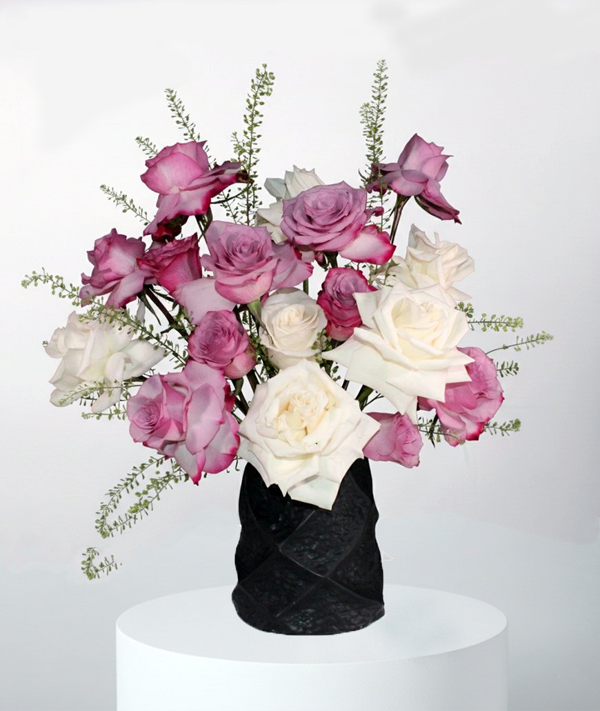 An elegant vase arrangement combining soft pink and white roses, enhanced with luxurious accents for a refined and sophisticated look. Ideal for stylish gifting and special occasions.