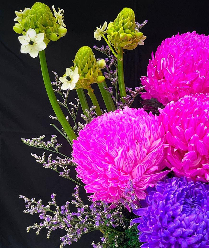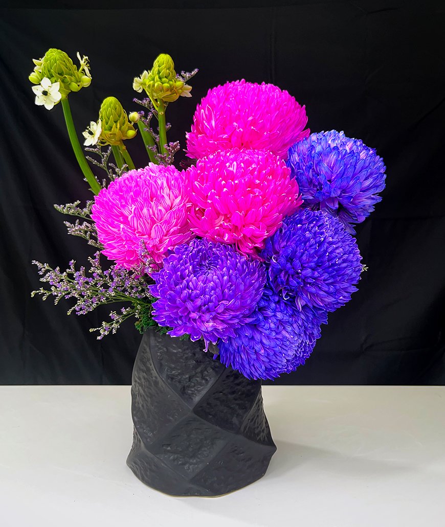 An elegant black vase adorned with decorative flowers in refined purple and blush tones, complemented by luxurious accessories for a modern, sophisticated statement.