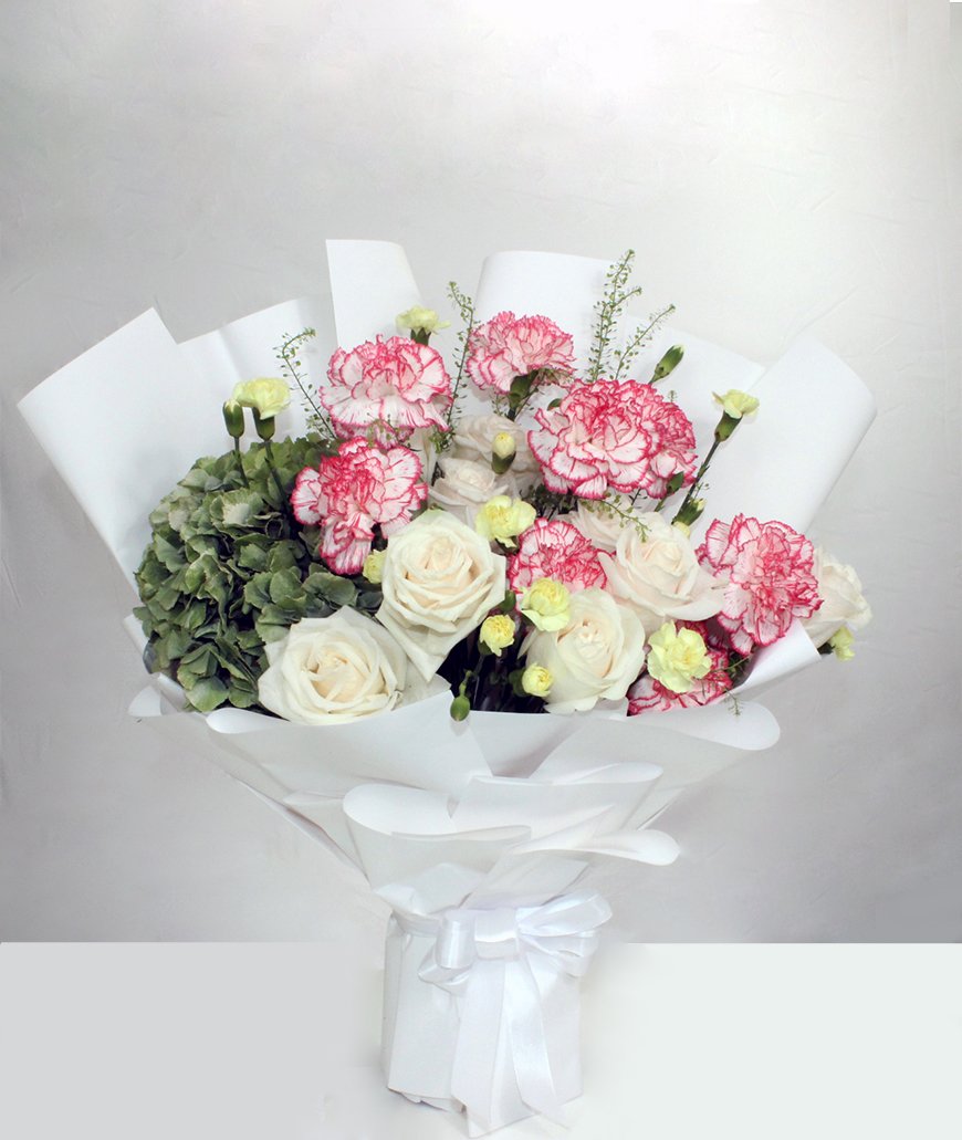 White Rose, Green Hydrangea & Pink Carnation Bouquet