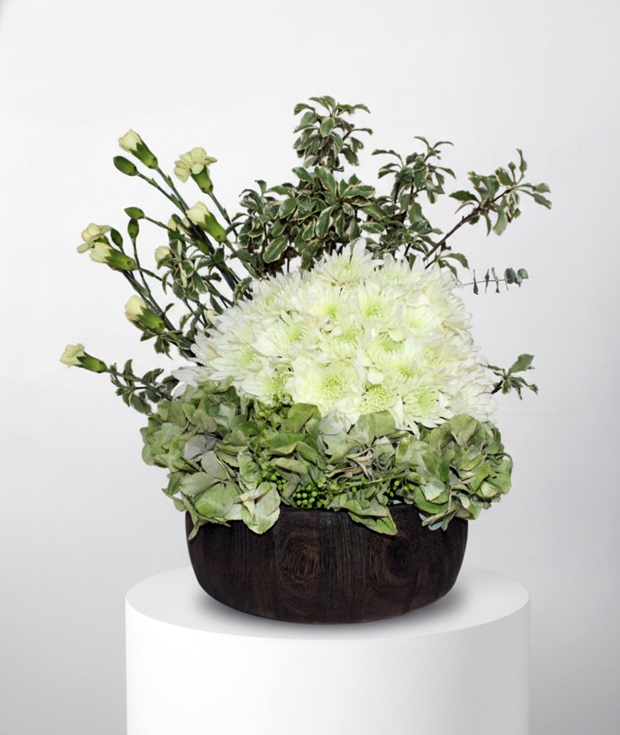 A luxurious wooden base adorned with premium hydrangeas, chrysanthemums, and baby carnations, complemented by elegant accessories. Perfect for sophisticated gifting and special occasions.