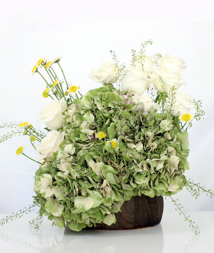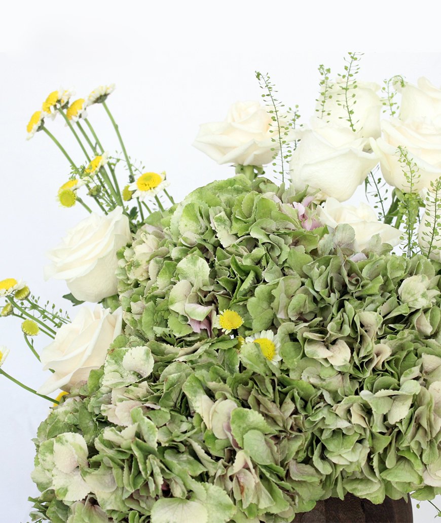 A luxurious wooden base adorned with premium hydrangeas and white roses, enhanced with elegant accessories. Perfectly crafted for sophisticated gifting and special occasions.